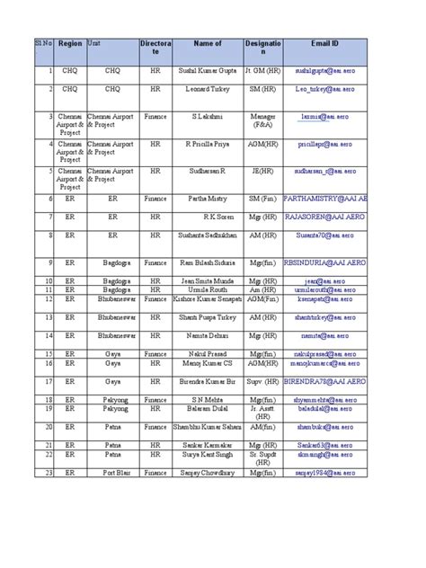 Alright, so what exactly should you anticipate finding when you come across an AAI HR name list PDF ? Typically, these lists are designed to be informative and practical. The most crucial piece of information, of course, is the name of the HR personnel . But it doesn’t stop there, guys. You’ll usually find their designation or job title . This is super important because it tells you their role and level of responsibility within the department. Are they a Senior Manager, an Assistant, a Director, or perhaps handling a specific function like Training or Recruitment? Knowing this helps you direct your communication effectively. Another key detail you’ll often see is their department or section . The AAI HR department is likely divided into various wings – maybe one for recruitment, another for employee welfare, payroll, industrial relations, or training and development. Identifying which section a person belongs to ensures you’re contacting the right specialist. Sometimes, you might even find their contact number or email address . This is the jackpot for direct communication! However, it’s worth noting that public-facing lists might sometimes omit direct contact details for privacy or security reasons, opting instead for general HR department contact information. You might also find information about their location or the specific airport/office they are associated with, especially if the AAI HR structure is decentralized. The goal of such a list is to provide a clear, concise, and actionable overview of the key individuals within the AAI’s Human Resources department. Think of it as a mini-directory that empowers you to navigate the organization’s HR landscape with confidence. A well-compiled list will be organized logically, perhaps alphabetically by last name, or by department, making it easy to scan and find what you need. The PDF format is ideal because it preserves the formatting and allows for easy searching if the document is text-based.