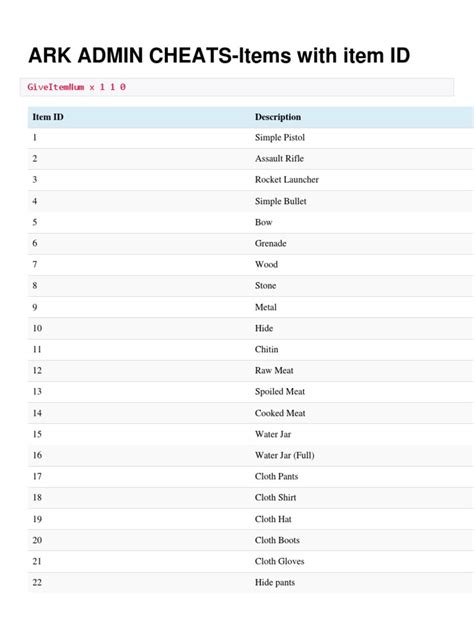 • GiveItemNum <itemID> <quantity> <quality> <blueprint> : Gives you any item in the game. Replace <itemID> with the item’s ID number, <quantity> with the amount you want, <quality> with the item’s quality (1-10), and <blueprint> with true or false (usually false ). For example, GiveItemNum 1 10 1 false gives you 10 Simple Pistols. Pro tip : Look up item IDs on the ARK Wiki for best results.