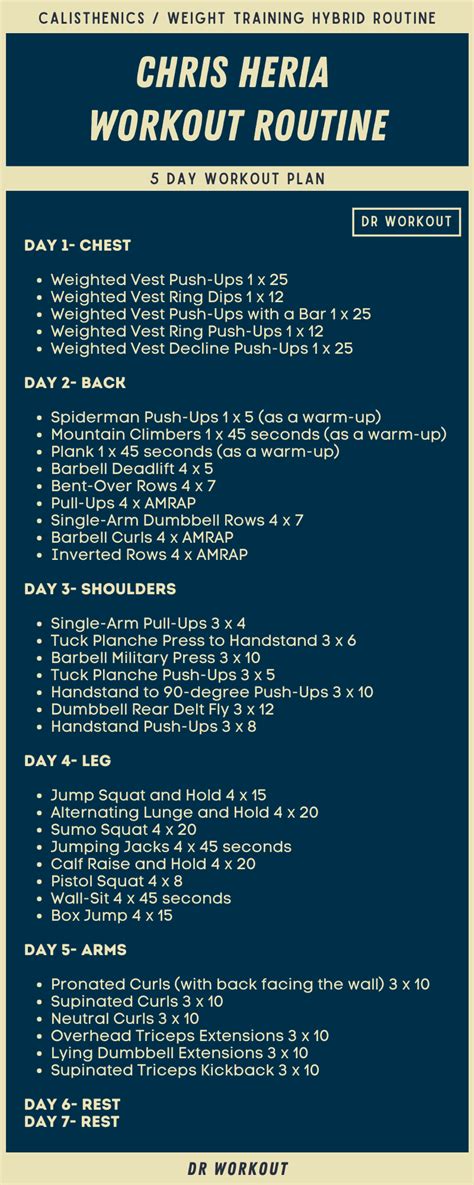 The core of the Chris Heria weekly workout plan revolves around a few key principles that make his approach so effective and, frankly, popular. First and foremost, it’s about efficiency . Heria is a big proponent of full-body training , often emphasizing hitting muscle groups multiple times a week rather than relying solely on traditional body part splits. This approach allows for increased protein synthesis and more frequent stimulation, which can lead to faster gains, especially for intermediates. He also heavily integrates calisthenics into his routines. Think pull-ups, push-ups, dips, and muscle-ups. These aren’t just flashy moves; they are compound exercises that work multiple muscle groups simultaneously, building incredible functional strength and that coveted V-taper. But it’s not all bodyweight. Heria skillfully blends calisthenics with weight training , incorporating exercises like squats, deadlifts, and overhead presses to ensure a well-rounded development. The goal is always to build a balanced physique – strong, lean, and aesthetically pleasing. He often talks about the importance of mind-muscle connection , ensuring that every rep counts and that you’re truly feeling the target muscle work. This isn’t about just going through the motions; it’s about controlled movements and deliberate effort. Another crucial aspect is progressive overload . Whether you’re using bodyweight or weights, the principle remains the same: you need to continually challenge your muscles to grow. This could mean adding more reps, more sets, reducing rest times, or increasing the difficulty of the exercise (e.g., adding weight to pull-ups or progressing to harder variations of push-ups). Finally, consistency is king. The Chris Heria weekly workout is designed to be followed consistently. It’s not a magic bullet; it’s a roadmap that, when followed diligently, yields significant results. He promotes a lifestyle that prioritizes training, nutrition, and recovery, recognizing that all three are integral to achieving your physique goals. So, when you look at a Heria-style week, you’re not just seeing a list of exercises; you’re seeing a holistic approach to fitness that prioritizes strength, aesthetics, and sustainable progress.