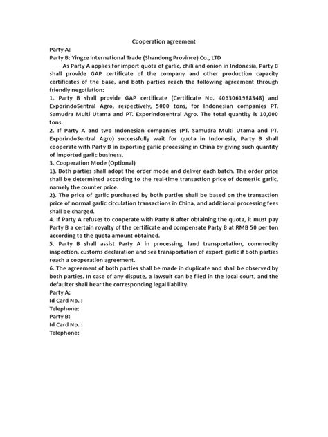 Now, let’s talk about what makes a contractual cooperation agreement actually work . A solid agreement is the backbone of any successful partnership, ensuring clarity and preventing disputes. First off, you absolutely need clear objectives and scope . What exactly are you trying to achieve together? Define the purpose of the cooperation in precise terms. What activities are included, and just as importantly, what’s excluded ? Vague goals lead to confusion, guys. Next up is defining roles and responsibilities . Who is doing what? Clearly outlining each party’s duties, contributions (whether financial, technical, or human resources), and decision-making authority is paramount. This avoids finger-pointing later on. Then there’s financial arrangements . How will costs be shared? How will profits and losses be distributed? This includes details on funding, payment schedules, and accounting procedures. Transparency here is non-negotiable. Another critical piece is intellectual property rights . If any IP is created or used during the cooperation, how will it be owned, managed, and protected? This is especially important in R&D collaborations. You also need to address term and termination . How long will the cooperation last? Under what conditions can any party exit the agreement? What happens upon termination, like the distribution of assets or ongoing obligations? This foresight is vital for a clean exit if needed. And speaking of disputes, a good agreement will include a dispute resolution mechanism . Will you try mediation first? Arbitration? Or go straight to court? Having a pre-defined process can save a lot of time and money. Lastly, confidentiality clauses are essential, especially when sensitive business information is being shared. You want to ensure that your trade secrets stay secret! A well-drafted agreement covers all these bases, providing a clear roadmap for collaboration and a safety net for all parties involved. It’s the legal blueprint for your business handshake.