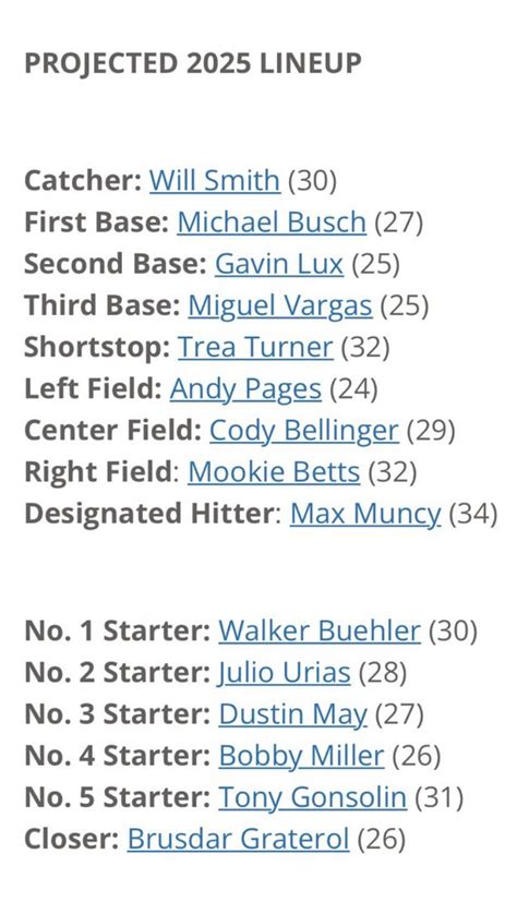 Hey baseball fanatics! Let’s dive deep into the crystal ball and gaze upon the Los Angeles Dodgers projected starting lineup for the 2025 season . We’re talking about a team that’s always in the mix, a powerhouse of talent, and a franchise with a knack for making headlines. Predicting a lineup a couple of years out is a fun challenge, involving projections, current player development, potential trades, and the ever-present wild card of injuries. But hey, that’s what makes it exciting, right? So, grab your peanuts and Cracker Jacks, and let’s break down who might be taking the field for the Dodgers in 2025, assuming health and the usual Dodgers’ savvy in the player market!