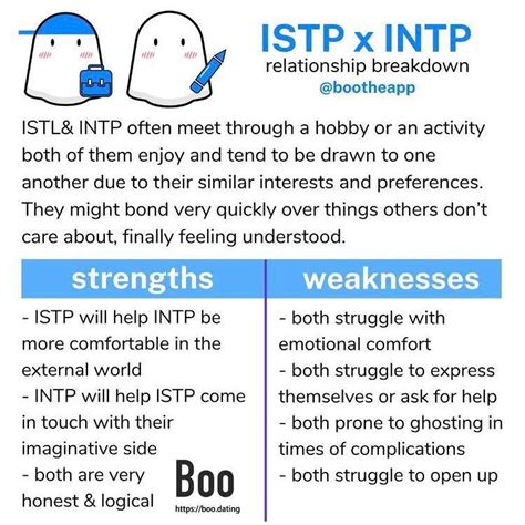 In friendships, INTPs and ISTPs can find common ground in their shared introversion and love for logical discussions. They are both likely to appreciate a friend who is independent, self-sufficient, and doesn’t demand constant attention. Their friendship might revolve around shared activities, such as playing video games, working on projects together, or engaging in intellectual debates. However, their different interests and perspectives can also lead to some interesting dynamics. INTPs might enjoy discussing abstract theories and philosophical concepts, while ISTPs might prefer to talk about practical matters and real-world events. To maintain a strong friendship, it’s important for both types to be open to each other’s interests and perspectives. INTPs should try to engage with the ISTP ’s practical concerns, while ISTPs should be willing to explore the INTP ’s intellectual pursuits. They can also bond over their shared love of problem-solving. INTPs might enjoy brainstorming ideas and coming up with creative solutions, while ISTPs might enjoy putting those solutions into practice. By working together on projects and challenges, they can strengthen their bond and develop a deeper appreciation for each other’s skills. Ultimately, an INTP and ISTP friendship can be a rewarding and fulfilling experience, as long as both individuals are willing to respect each other’s differences and appreciate their unique strengths.