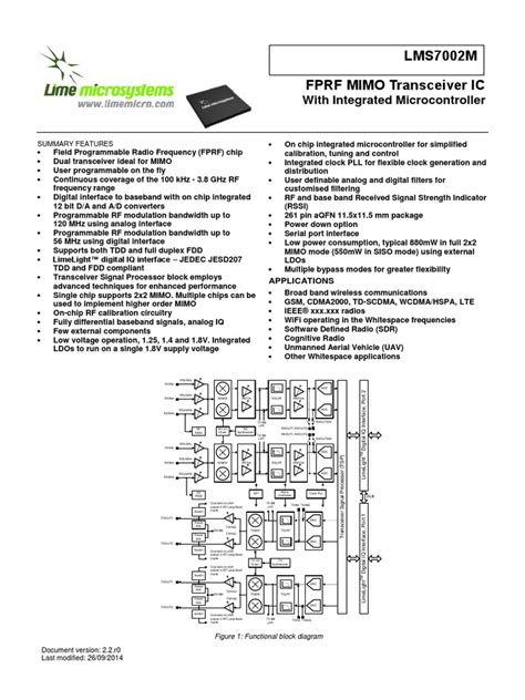 So, what exactly is the LMS7002M? This bad boy is a highly integrated, single-chip 2x2 MIMO (Multiple-Input Multiple-Output) RF transceiver. It’s designed for a whole range of wireless applications, from cellular base stations to Wi-Fi and beyond. What makes it so special is its flexibility. It can operate across a wide frequency range, from 20 MHz all the way up to 6 GHz. Plus, it’s got two complete receive and transmit channels, which is super handy for MIMO systems. This level of integration means fewer external components, smaller board sizes, and potentially lower costs for your projects. However, all this power and flexibility come with a learning curve, especially when it comes to LMS7002M programming and calibration . You need to get the settings dialed in perfectly for optimal performance.