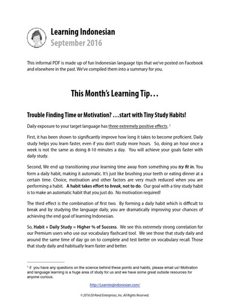 Jangan pernah merasa bahwa kemajuan kalian lambat atau merasa putus asa ketika membuat kesalahan. Ingat, setiap kesalahan adalah pelajaran . Bahkan penutur asli pun kadang membuat kesalahan, kok . Yang terpenting adalah terus mencoba dan tidak menyerah . Bangun kebiasaan belajar yang menyenangkan dan sesuai dengan gaya belajar kalian . Jika kalian suka mendengarkan musik, dengarkan lagu-lagu Indonesia. Jika kalian suka menonton, tonton film atau vlog berbahasa Indonesia. Integrasikan bahasa Indonesia ke dalam aktivitas sehari-hari kalian. Misalnya, coba berpikir dalam bahasa Indonesia saat sedang melakukan pekerjaan rutin, atau mengganti bahasa pengaturan di ponsel kalian ke bahasa Indonesia. Paparan yang konstan adalah kunci untuk mempercepat proses pembelajaran .