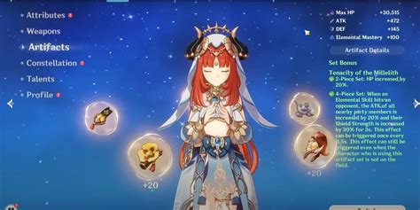 The best artifact set for Nilou is generally considered to be 2-Piece Tenacity of the Millelith and 2-Piece Vourukasha’s Glow , providing a significant HP boost. The alternative is 2-Piece Tenacity of the Millelith and 2-Piece Heart of Depth , but this one is a bit less strong.