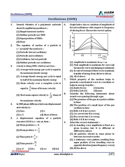 There are several types of oscillations, each with its own unique characteristics. Simple harmonic motion (SHM) is perhaps the most fundamental. It describes the motion of a system where the restoring force is proportional to the displacement from the equilibrium position. Think of a perfect spring-mass system: when you pull the mass, the spring pulls back with a force proportional to how much you pulled it. This leads to a smooth, repeating motion. Then, there are damped oscillations, which occur when energy is lost from the system, causing the oscillations to gradually decrease in amplitude over time. This happens because of friction, air resistance, or other factors that dissipate energy. Finally, we have forced oscillations, where an external force drives the system. These can lead to resonance, a phenomenon where the system oscillates with a much larger amplitude when the driving force’s frequency matches the system’s natural frequency. Oscillations are described using parameters like frequency, amplitude, and phase. Frequency tells us how often the oscillation repeats, amplitude tells us the maximum displacement from equilibrium, and phase tells us where the oscillation is in its cycle at a given time. These parameters are crucial for understanding the behavior of oscillating systems.