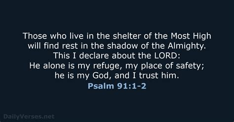 • Verse 2: This I declare about the Lord: He alone is my refuge, my place of safety; he is my God, and I trust him. ” This verse is about a personal declaration. It’s a statement of faith, a claim to your relationship with God. It’s like you’re saying, “He’s the only one I trust.” This verse is the first step in starting and maintaining a relationship with God.