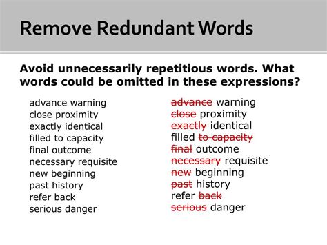 Now, why should you even care about redundant words ? Well, guys, they can actually have a pretty big impact on how your message is received. When you pack your sentences with unnecessary words, you risk making your communication sound less professional, less clear, and frankly, a bit lazy. Imagine you’re reading an article, and the author keeps saying things like “final conclusion” or “personal opinion.” It makes you pause, right? You start thinking, “Is this conclusion not final? Is this opinion not personal?” This kind of wordiness can create doubt and confusion in the reader’s mind. It distracts from the core message you’re trying to convey. Instead of focusing on what you’re saying, the reader might get bogged down in how you’re saying it, or worse, they might just tune out altogether. In professional settings, especially in business writing, emails, or presentations, conciseness is king. Using redundant phrases can make you seem less credible and less intelligent. It suggests you haven’t taken the time to refine your thoughts or that you lack a strong command of the language. Think about a resume: you want every word to count, to be impactful. “Summarize briefly” is redundant; “summarize” is enough. “Completely finish” is also redundant; “finish” does the job. Every extra word is a missed opportunity to use a more precise or powerful term. Furthermore, in creative writing or storytelling, every word needs to pull its weight. Redundancy can slow down the pacing and dilute the impact of your narrative. It’s like adding unnecessary details to a painting – it just muddles the overall picture. So, by eliminating these wordy phrases, you’re not just making your sentences shorter; you’re making them stronger, clearer, and more persuasive. You’re showing respect for your audience’s time and attention.