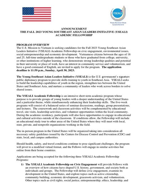 Hey everyone! Are you an emerging leader from Southeast Asia looking for an incredible opportunity to boost your academic and leadership skills? Then look no further , because the Spring 2023 YSEALI Academic Fellowship is something you absolutely need to know about! This fellowship, sponsored by the U.S. Department of State, is a fantastic program designed to empower young leaders like you with the knowledge, skills, and networks needed to make a real difference in your communities. In this comprehensive guide, we’ll dive deep into everything you need to know about the Spring 2023 YSEALI Academic Fellowship, from eligibility requirements and application tips to what to expect during the program and how it can shape your future. So, grab a coffee (or your favorite beverage), and let’s get started!