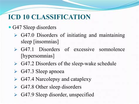 Under the umbrella of G47.9 , we find a diverse range of sleep-related problems. This can include: primary insomnia, where sleep troubles aren’t caused by any other underlying health condition; idiopathic hypersomnia, characterized by excessive daytime sleepiness for no known reason; and even some cases of restless legs syndrome or periodic limb movement disorder that haven’t been precisely diagnosed. The possibilities are truly varied, which is why a thorough evaluation by a healthcare professional is super important. The specific types of sleep disorders that can be categorized within this broad code include sleepwalking, sleep terrors, and other parasomnias (abnormal behaviors during sleep). In some cases, it might even be used as a preliminary diagnosis when a patient presents with symptoms that are suggestive of a sleep disorder, but further testing is required. Some common symptoms might include difficulty falling asleep, staying asleep, or feeling refreshed after sleep. Other individuals may experience excessive daytime sleepiness, leading to fatigue, difficulty concentrating, or even accidents. The scope of G47.9 also reflects the complexity of sleep and its profound impact on health and well-being. So, it’s not simply a matter of getting enough hours of sleep, it’s about the quality of that sleep too.