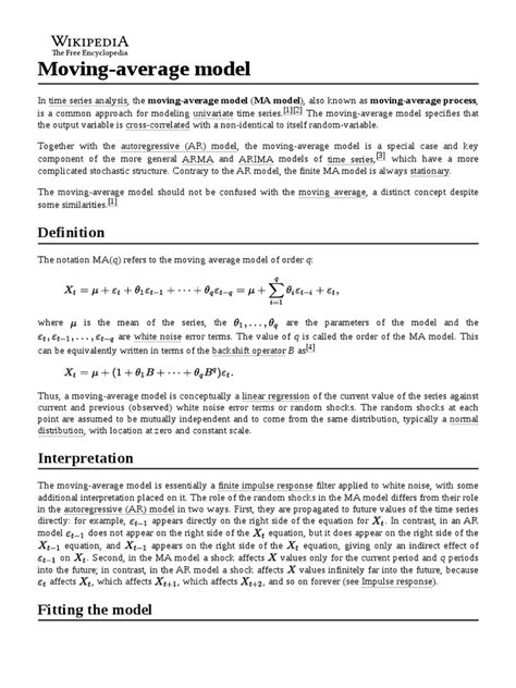 So, what is this Moving Average Model, you ask? Essentially, the Moving Average Model is a type of statistical model that uses the past forecast errors to create a new forecast. Unlike its simpler cousin, the simple moving average (SMA), which just averages past data points, the MA model focuses on the residuals or errors from previous predictions. Imagine you’re trying to predict tomorrow’s temperature. You make a prediction today, but it’s a bit off. The MA model takes that error – how much you were wrong by – and uses it to adjust your prediction for the next day. It’s like learning from your mistakes, but in a super mathematical way! This makes it a key component of the broader ARIMA (Autoregressive Integrated Moving Average) models , which are a staple in time series forecasting. The core idea is that future errors are correlated with past errors, and by modeling this correlation, we can improve our predictions. It’s a powerful way to capture the ‘memory’ of the errors in a time series. We’re talking about smoothing out random fluctuations and identifying the actual direction the data is heading. It’s not just about looking backward at the data itself, but also looking backward at how our predictions performed. This subtle but crucial difference is what gives the MA model its forecasting power, guys!
