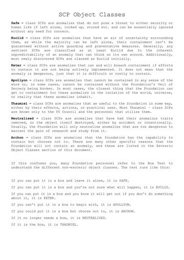 So, why do we even need new SCP object classes when we’ve got the classic Safe, Euclid, and Keter already? Great question, guys! The original classification system, while brilliant and foundational, was designed to cover a broad spectrum of anomalies. Safe objects are predictable and can be locked up with relative ease. Euclid objects are less understood or require more complex containment procedures, meaning they’re not quite as straightforward as Safe. Keter objects are the real nightmares, posing a significant threat to humanity and requiring immense resources and effort to contain, if containment is even fully possible. Then there’s Thaumiel, the heavy hitters, anomalies used by the Foundation itself to contain other anomalies. This system works incredibly well for a vast majority of SCPs. However, the SCP universe is constantly expanding, and authors are coming up with increasingly complex, abstract, or conceptually challenging anomalies. Think about anomalies that aren’t physical objects, or ones that exist across multiple realities, or entities whose very nature defies simple containment. Some anomalies might operate on a meta-level, affecting the narrative of the SCP universe itself, or perhaps they are concepts rather than tangible things. In these cases, the traditional Safe-Euclid-Keter framework can feel a bit clunky or insufficient. This is where the creativity of the community shines! Authors start to propose or adopt new classification systems and specific classes to better reflect the unique challenges and characteristics of their SCPs. It’s all about finding the perfect descriptor for the anomaly’s containment difficulty, its potential threat, and its fundamental nature. It shows how the SCP universe is a living, breathing thing, constantly evolving and adapting to new ideas. The development of new object classes isn’t just about slapping a new label on something; it’s about rethinking the very logic of containment and classification when faced with anomalies that push the envelope of what we thought was possible within the SCP framework. It’s a testament to the collaborative spirit and boundless imagination that makes the SCP Foundation so enduringly popular. The introduction of new classes often sparks debate and discussion within the community, leading to even further refinement and innovation. It’s a dynamic process, ensuring the universe stays fresh and exciting for readers and writers alike. So, when you see a classification beyond the big four, it usually means you’re in for something truly unique and mind-bending. It’s the Foundation’s way of saying, “Okay, this one is special , and we need a special way to talk about it.”