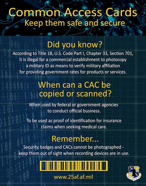 Now, let’s get serious for a second, guys, because protecting your US military CAC card is absolutely non-negotiable. This isn’t just about preventing a minor inconvenience; it’s about safeguarding sensitive information and maintaining national security. The first and most important rule: Never share your CAC PIN . Your Personal Identification Number (PIN) is like the key to your digital kingdom. It’s what unlocks the chip and allows you to use its cryptographic functions. If someone else gets your PIN, they can potentially access your accounts, impersonate you, and compromise secure systems. Treat your PIN with the same level of secrecy as you would a classified password. Next up: Keep your card physically secure . This means not leaving it lying around unattended, especially in public places or unsecured areas. If you’re not using it, keep it in a wallet, a secure pouch, or a designated secure location. Think of it like your actual wallet – you wouldn’t leave that lying around, right? Report lost or stolen cards immediately . If you realize your CAC card is missing, don’t delay. Contact your local RAPIDS facility or security office right away to report it. The sooner it’s reported, the sooner it can be deactivated, preventing unauthorized use. This is a crucial step in mitigating potential damage. Be aware of phishing attempts . Scammers might try to trick you into revealing your CAC information or PIN through fake emails or websites. Always be suspicious of unsolicited requests for your personal or card information. If something seems off, it probably is. Verify any requests through official channels. Finally, understand the card’s lifecycle . CAC cards have expiration dates. Make sure you’re aware of yours and get it renewed before it expires to avoid any disruptions in access or functionality. Keeping your card up-to-date is also a security measure, as older cards might have less robust security features. By following these best practices, you’re not only protecting yourself but also contributing to the overall security of the military network and its personnel. It’s a team effort, after all!