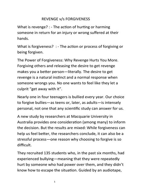 So, there you have it, guys. We’ve explored the destructive nature of revenge and highlighted the profound, healing power of forgiveness . It’s clear that while the urge for revenge might feel natural in the face of hurt, it’s ultimately a dead end. It keeps us trapped in cycles of anger, bitterness, and pain, often causing more harm to ourselves than to the intended target. Revenge offers a fleeting, hollow satisfaction, if any at all, and it prevents us from truly moving forward. It’s like trying to extinguish a fire by throwing gasoline on it – utterly counterproductive. On the other hand, forgiveness is not about weakness or condoning wrongdoing. It is a deliberate, courageous act of self-empowerment. It’s about taking back control of your emotional well-being and refusing to let past hurts dictate your present happiness or future potential. By choosing to forgive, you are choosing peace over pain. You are releasing yourself from a heavy burden, freeing up mental and emotional energy that can be channeled into personal growth, healing, and building a more positive life. The journey to forgiveness might not be easy. It requires patience, self-compassion, and a conscious effort to let go. But the rewards are immense: reduced stress, improved mental and physical health, greater resilience, and a deeper sense of inner peace. Think about the legacy you want to leave. Do you want to be remembered as someone who held onto grudges and sought retribution, or as someone who had the strength to rise above, to heal, and to find peace? The choice is yours, and it’s a choice that impacts not only your own life but also the lives of those around you. Ultimately, embracing forgiveness is a testament to your inner strength and your commitment to living a full, happy, and healthy life. It’s about understanding that while you cannot change the past, you have the power to shape your future by choosing how you respond to it. So, let’s commit to choosing peace. Let’s commit to the practice of forgiveness. Because in the grand scheme of things, it is always, always better than revenge.